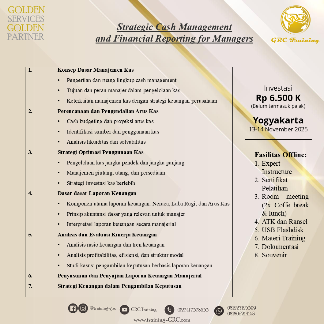 Strategic Cash Management and Financial Reporting for Managers adalah program pelatihan yang dirancang untuk meningkatkan kemampuan para manajer dalam mengelola arus kas perusahaan secara strategis serta memahami dan menganalisis laporan keuangan sebagai dasar pengambilan keputusan bisnis yang efektif.